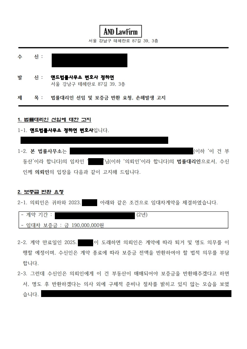이에 의뢰인은 99LAW(앤드 법률사무소) 99내용증명을 통해 전세 보증금 반환을 정식으로 요청했습니다.