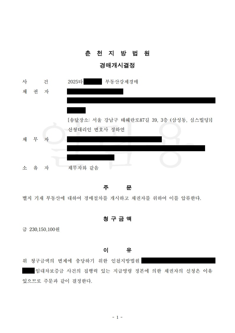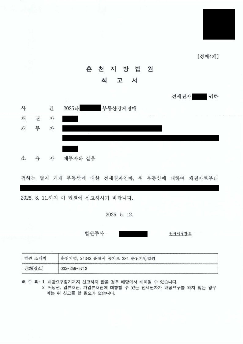 - 2025년 5월 15일 / 부동산 강제 경매 최고서 수령 완료