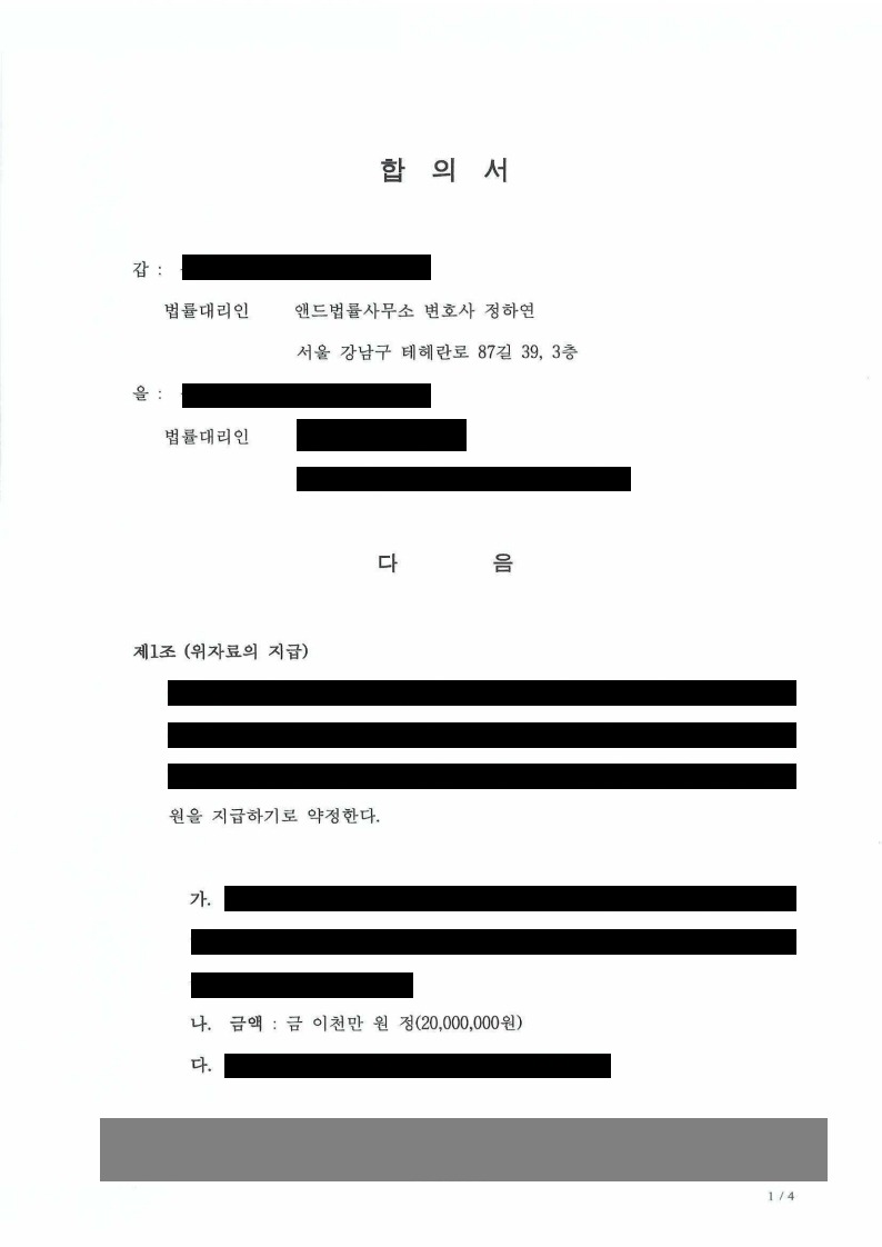 ▲ 99LAW(앤드 법률사무소) 상간녀 합의서 작성 완료 및 합의금 2,000만 원 수령 ▲