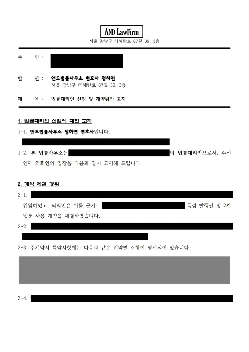 - 의뢰 사유 : 웹소설 원고를 제공받지 못해 2차 제작 계약에 문제가 생겨 계약 이행을 촉구하는 내용증명 발송